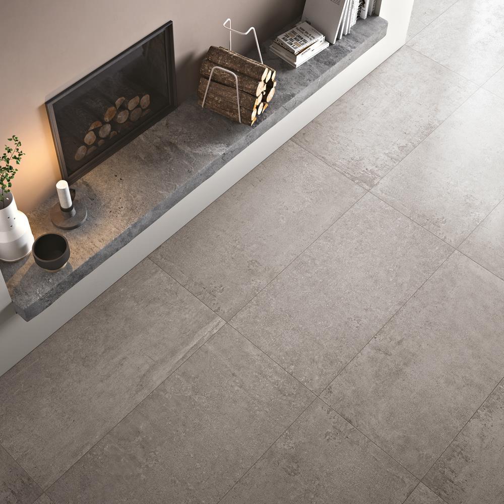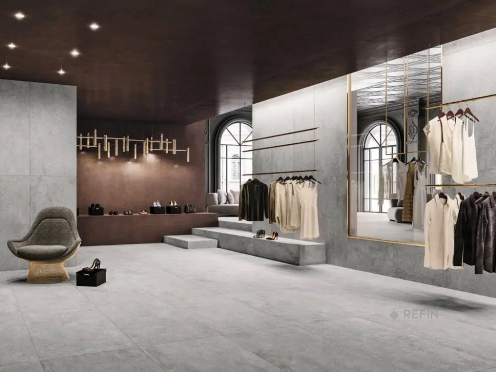 Le carrelage béton brut habille sols et murs avec un style industriel et contemporain.