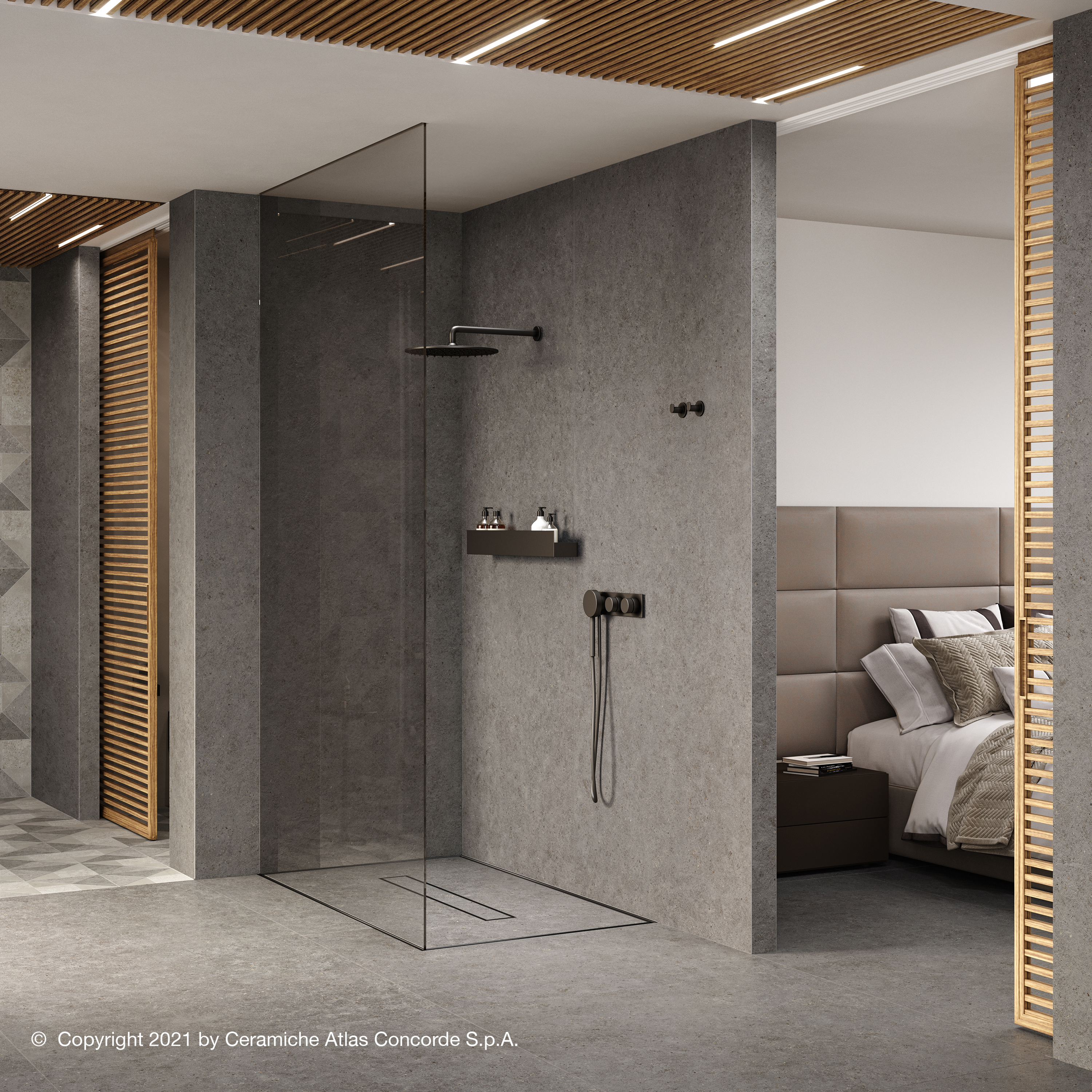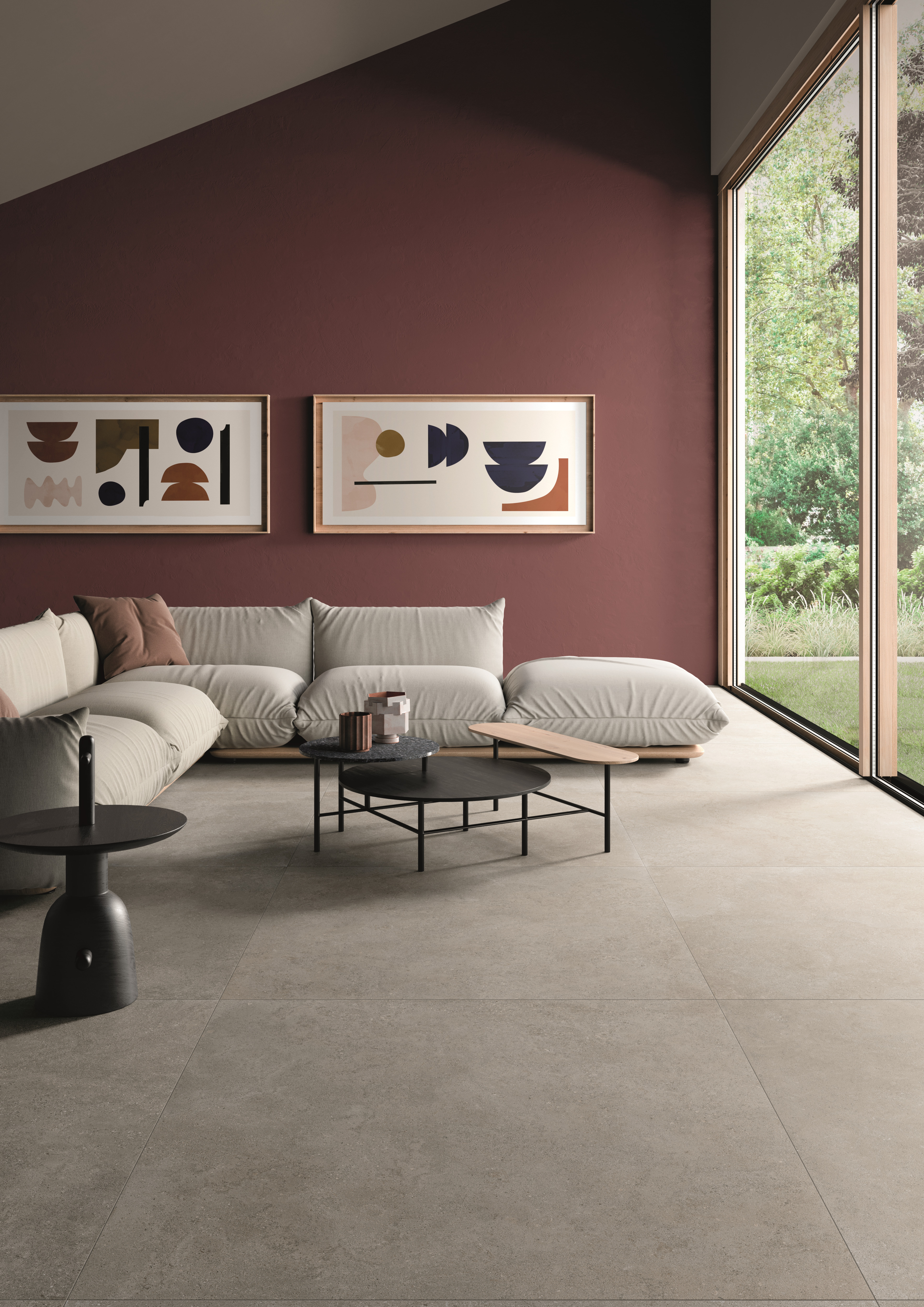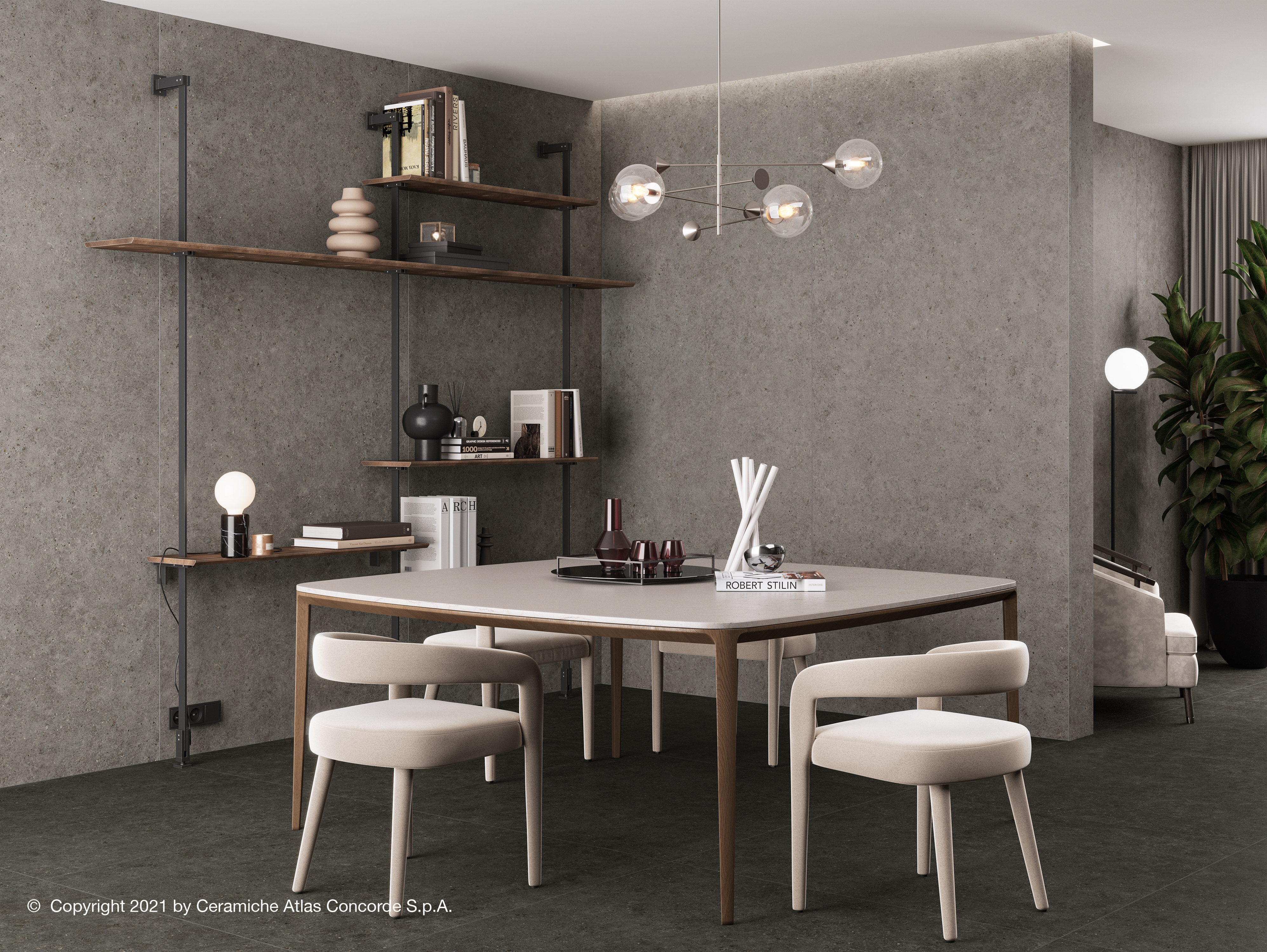 Son motif ponctué apporte une lecture visuelle homogène, idéale pour les espaces très fréquentés, tout en créant une atmosphère naturelle et maîtrisée sur sols comme sur murs.
