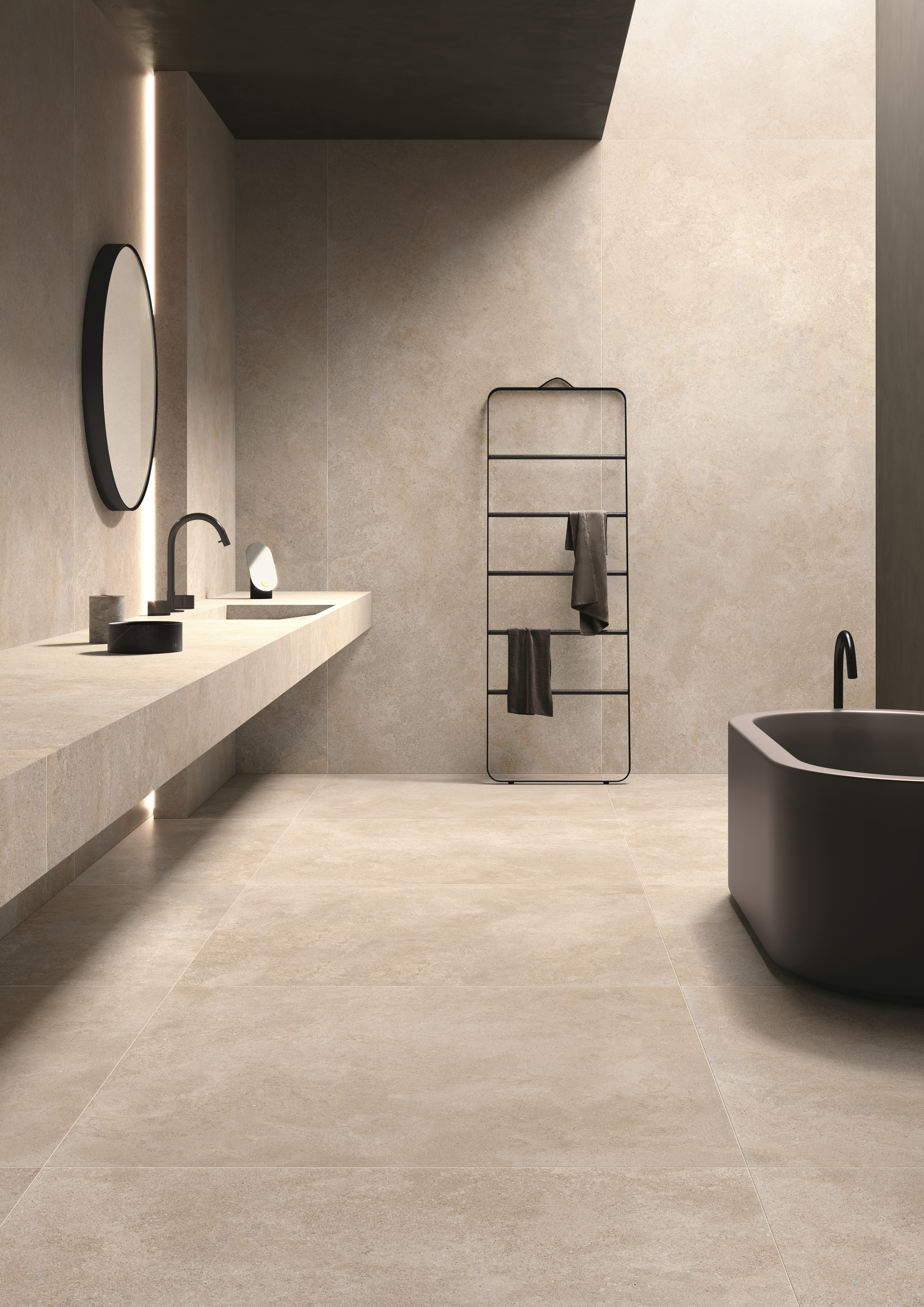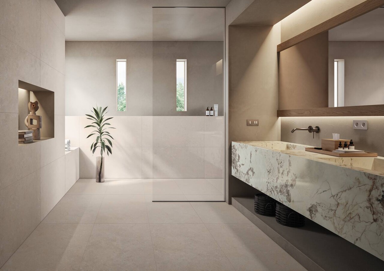 Ce carrelage au rendu pierre mouchetée séduit par son aspect texturé et équilibré.