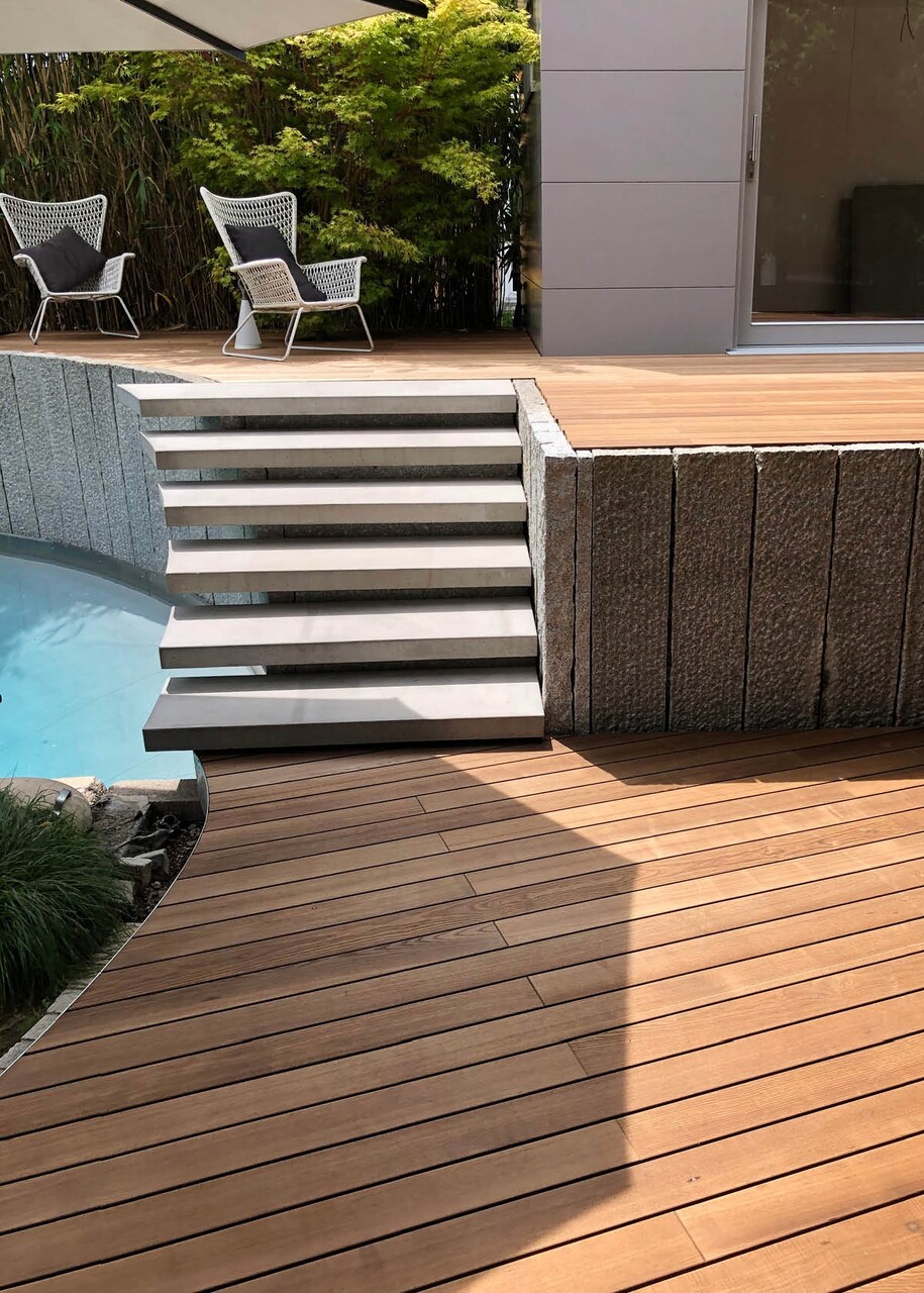 Le decking en frêne thermotraité combine robustesse, longévité et aspect chaleureux, un excellent choix pour un extérieur soigné et durable.