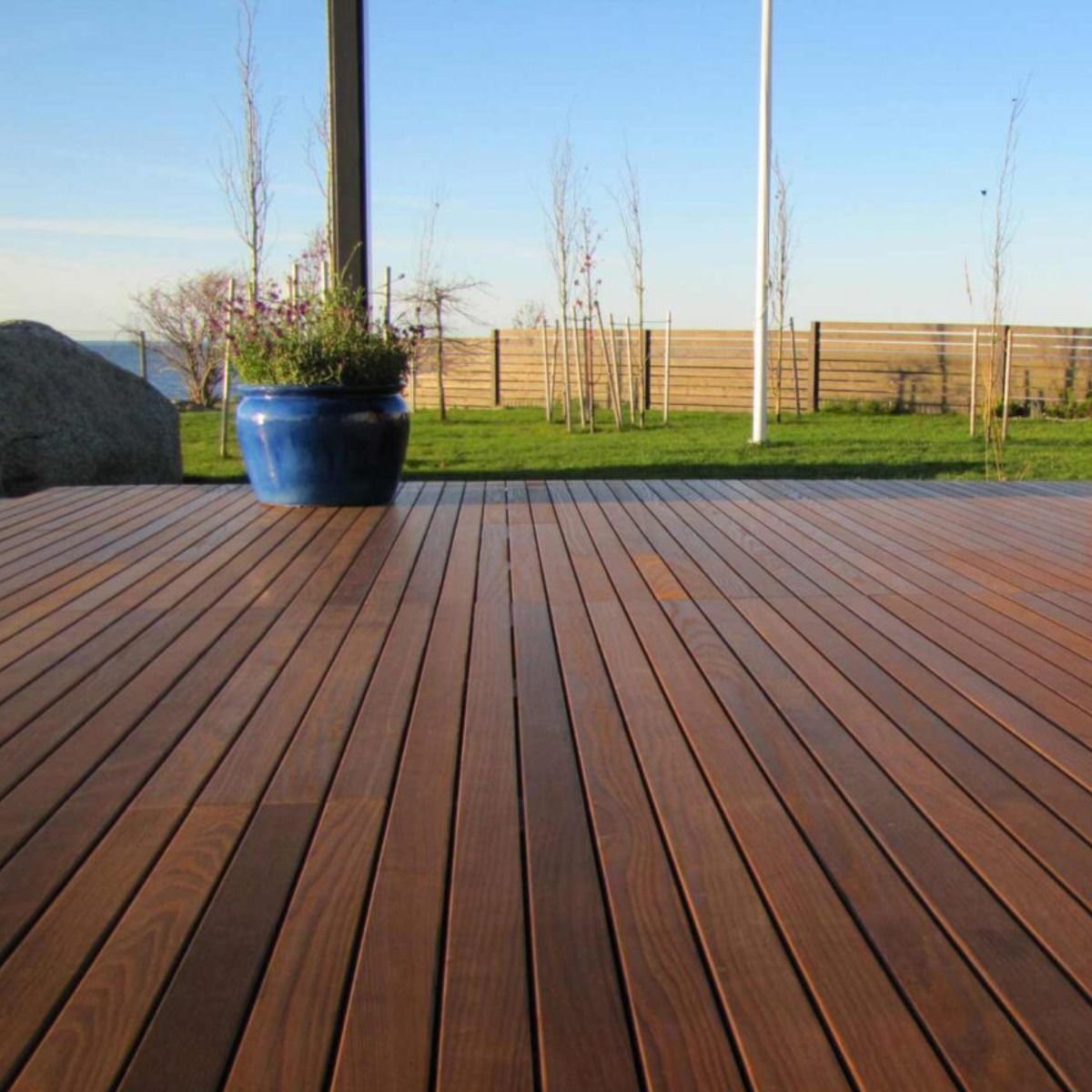 Avec sa teinte chaleureuse, son veinage élégant et son absence de nœuds marqués, ce bois offre un rendu esthétique raffiné et naturel, idéal pour une terrasse accueillante et durable.