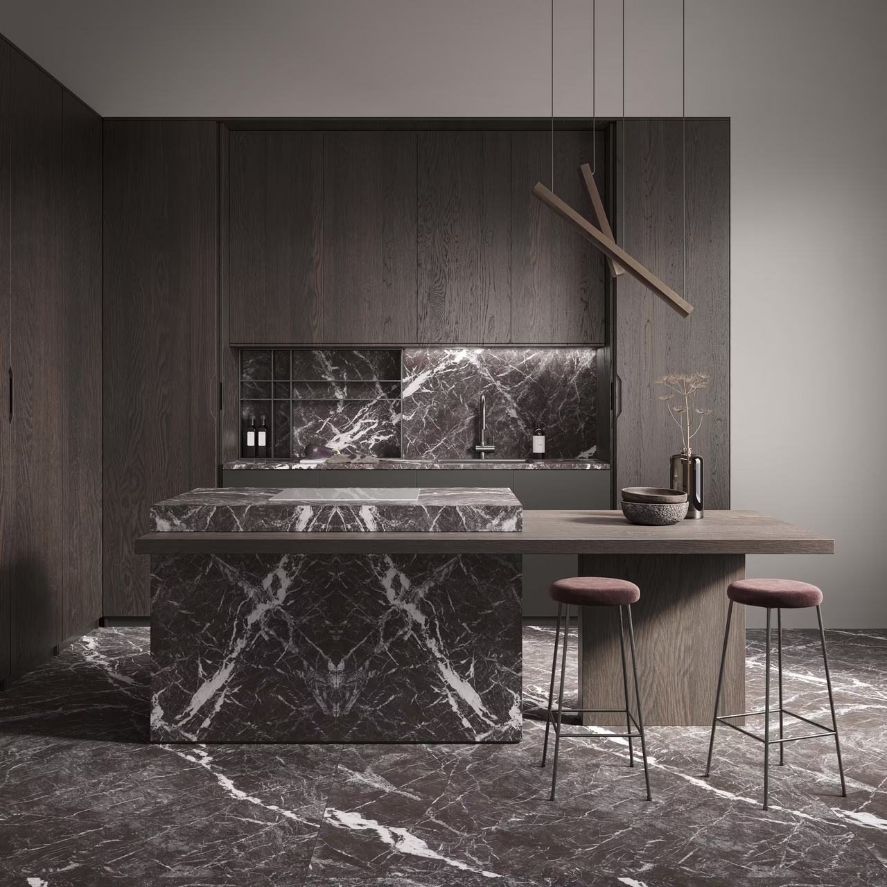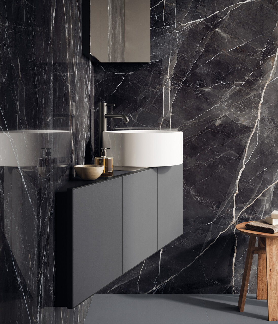 Dans une cuisine, salle de bains, salon ou hall dâentrĂ©e, le marbre noir crĂ©e un contraste Ă©lĂ©gant avec les Ă©lĂ©ments clairs, tout en apportant profondeur et caractĂšre Ă la piĂšce.